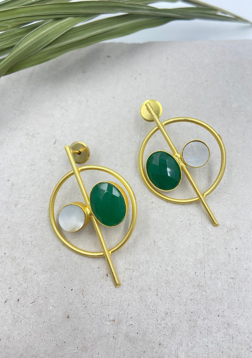 Gold Plated Circular Emerald Quartz Drop Earrings - QUEENS JEWELS