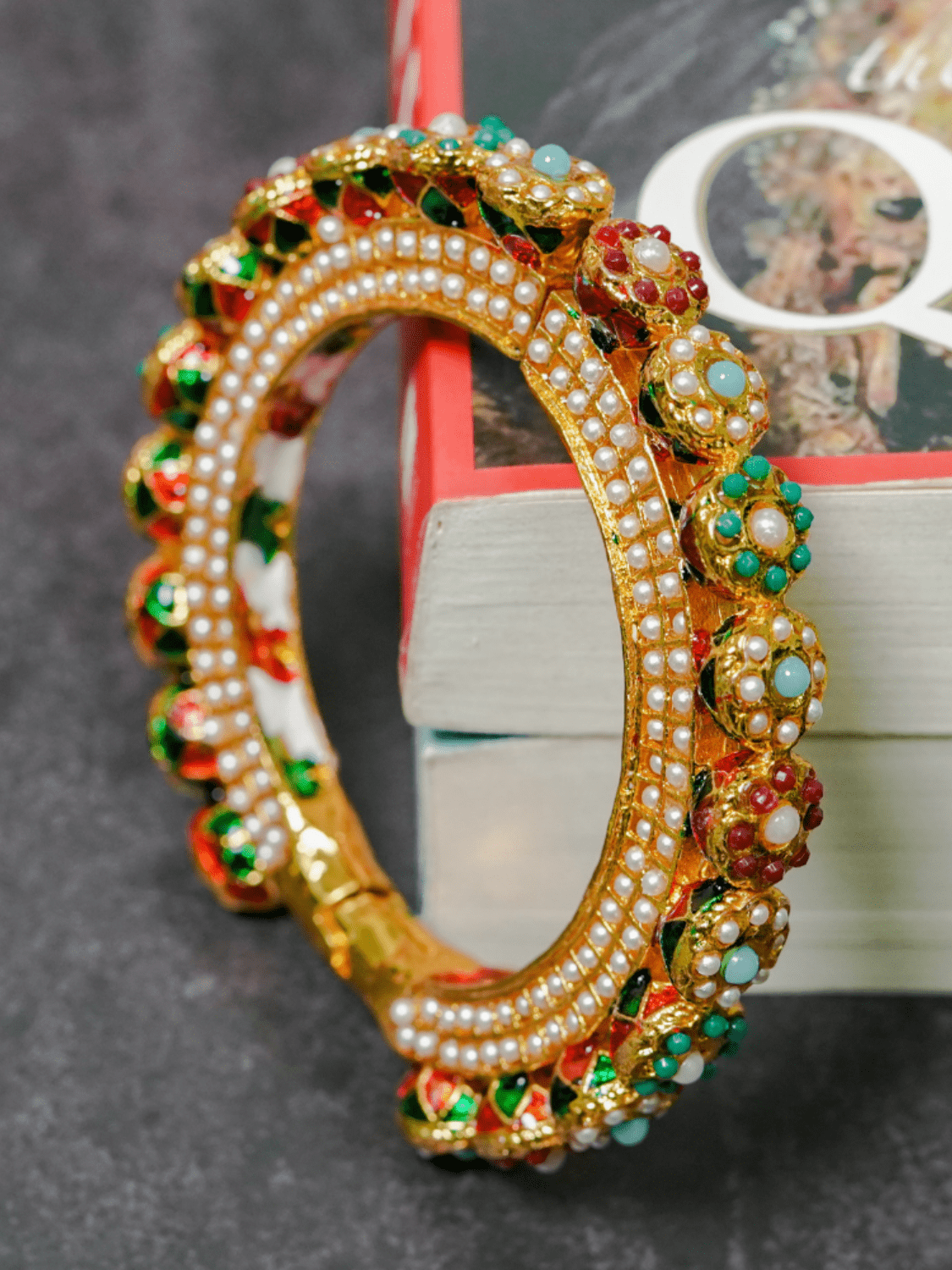 The Preeta pacheli openable bangle with an extravagance of colors and textures is a beautiful traditional piece with jadau and little bit of meenakari on the edges.