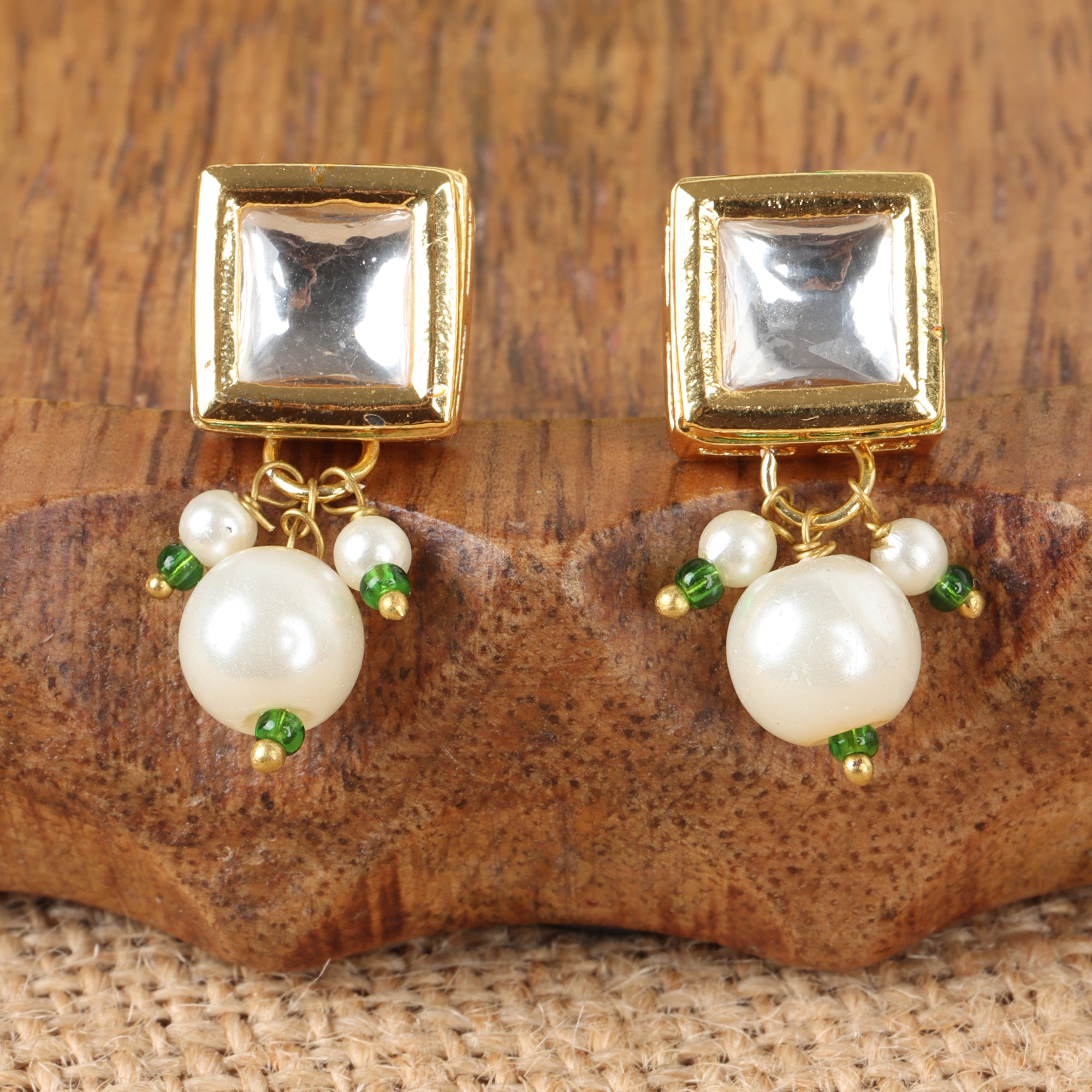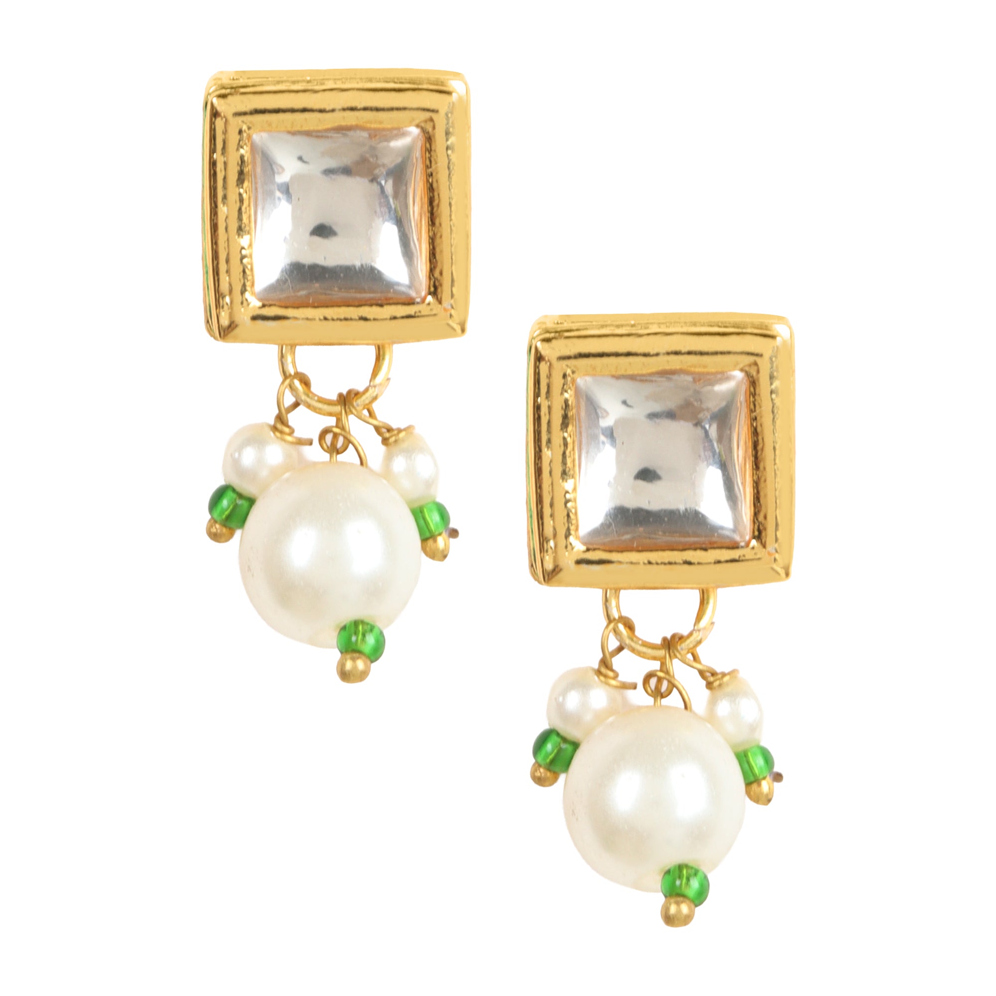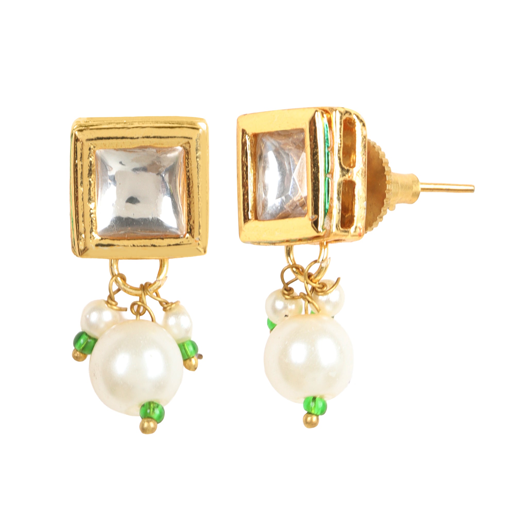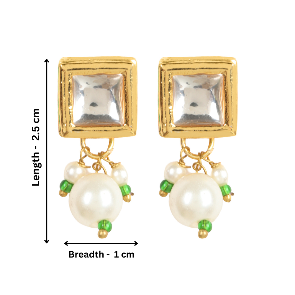 Classic white Kundan stones set in a square-shaped gold-plated stud, enhanced with a dangling pearl for subtle elegance. Lightweight and versatile, perfect for festive wear or adding a touch of sophistication to daily attire. Includes an extra pair of push buttons and washers and comes in box - perfect for gifting on Valentine’s Day, Mother’s Day, Rakhi, or any special occasion.