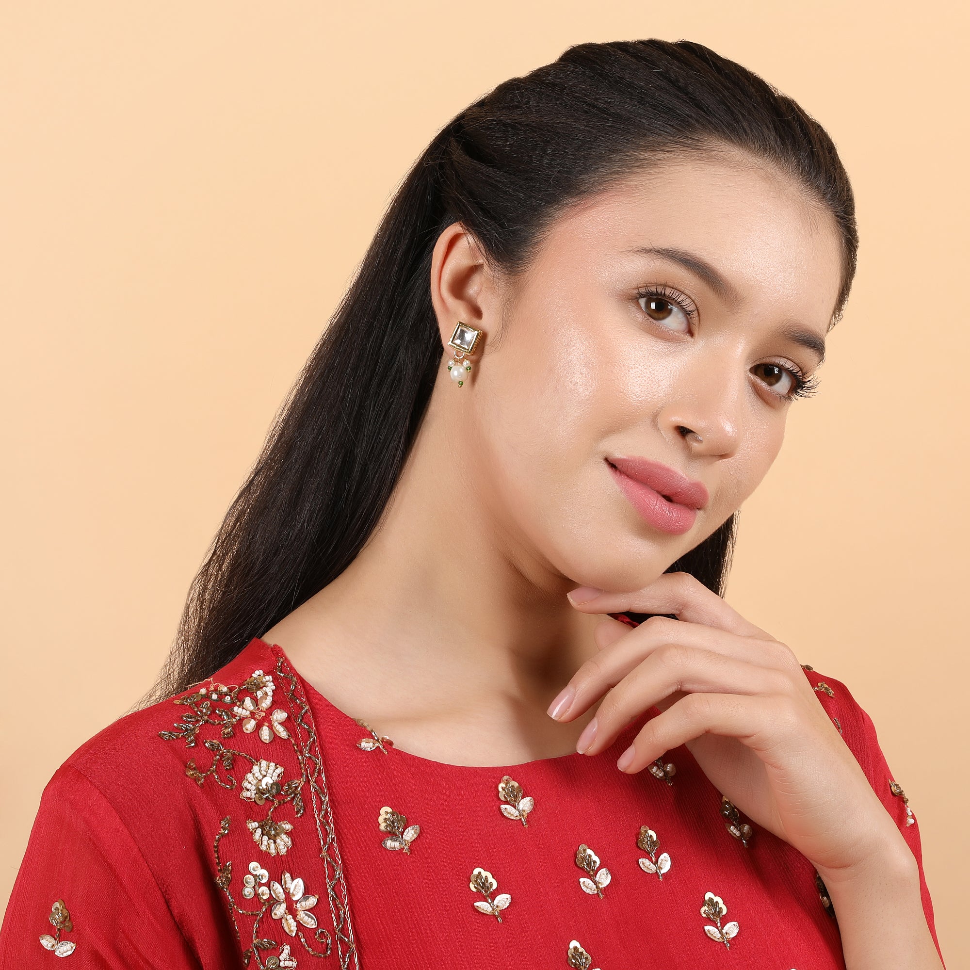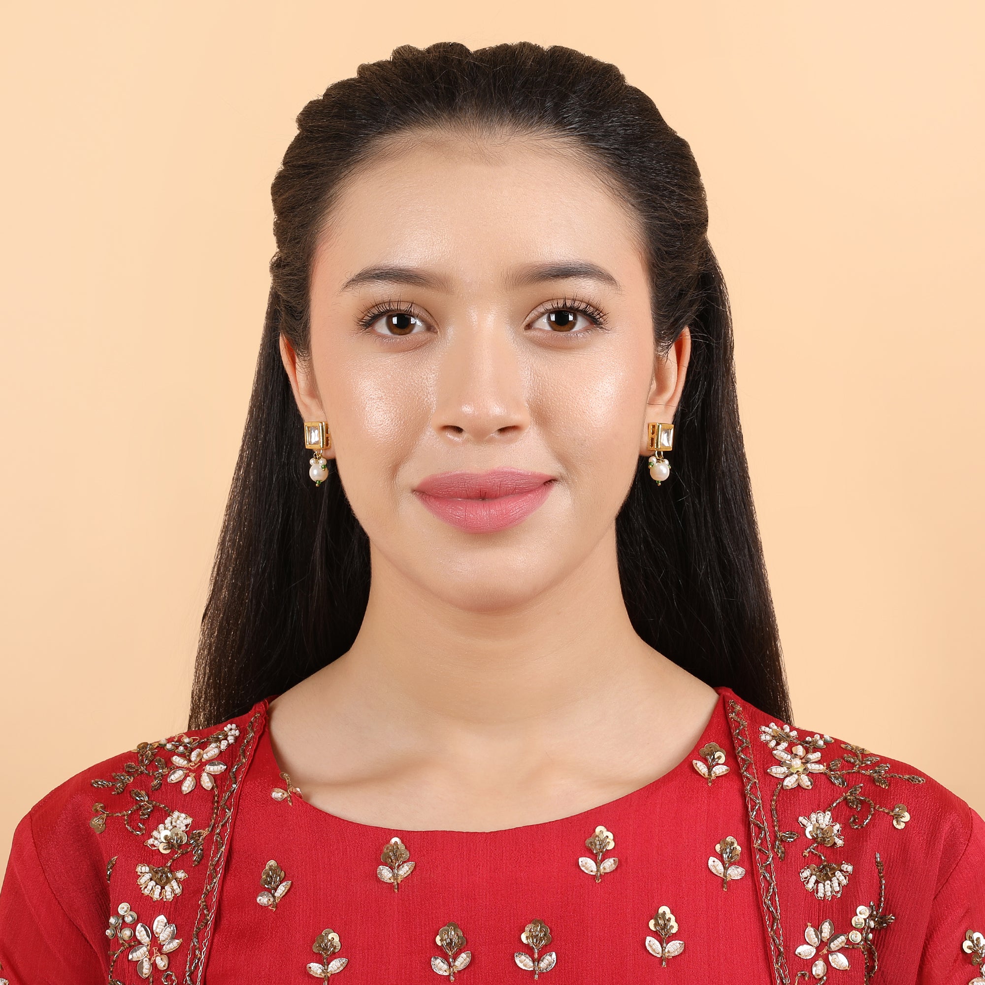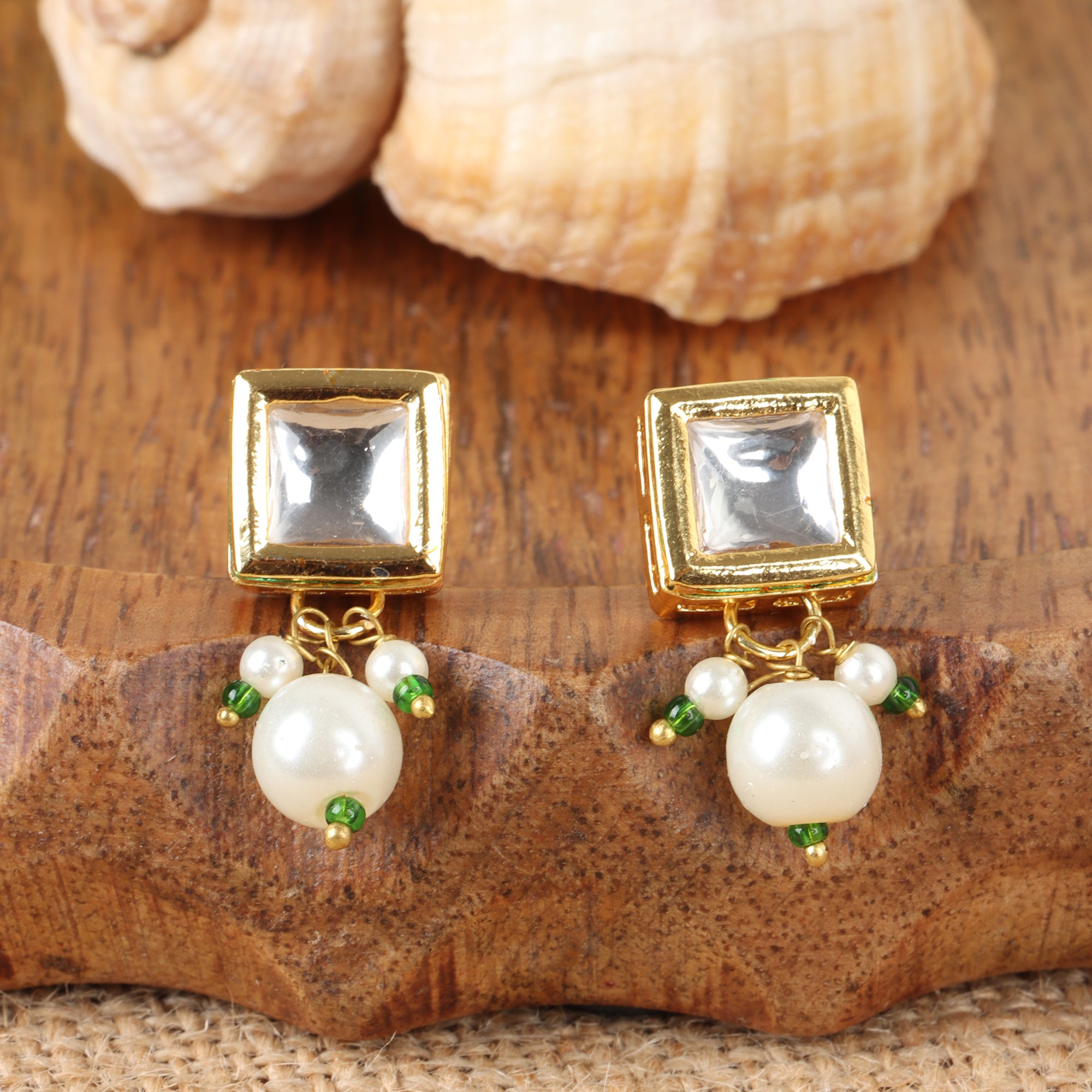 Classic white Kundan stones set in a square-shaped gold-plated stud, enhanced with a dangling pearl for subtle elegance. Lightweight and versatile, perfect for festive wear or adding a touch of sophistication to daily attire. Includes an extra pair of push buttons and washers and comes in box - perfect for gifting on Valentine’s Day, Mother’s Day, Rakhi, or any special occasion.