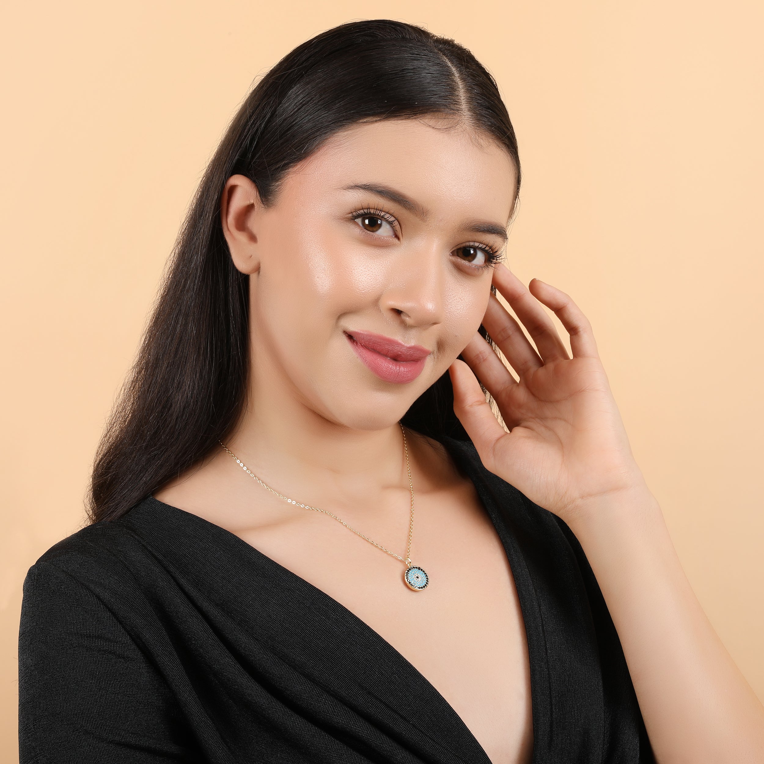 A delicate gold-plated chain with a round evil eye pendant accented with turquoise detailing. Elegant and versatile, it adds a subtle charm to everyday or festive looks. It comes beautifully packaged in a box—perfect for gifting on Valentine’s Day, Friendship Day, or any special occasion.