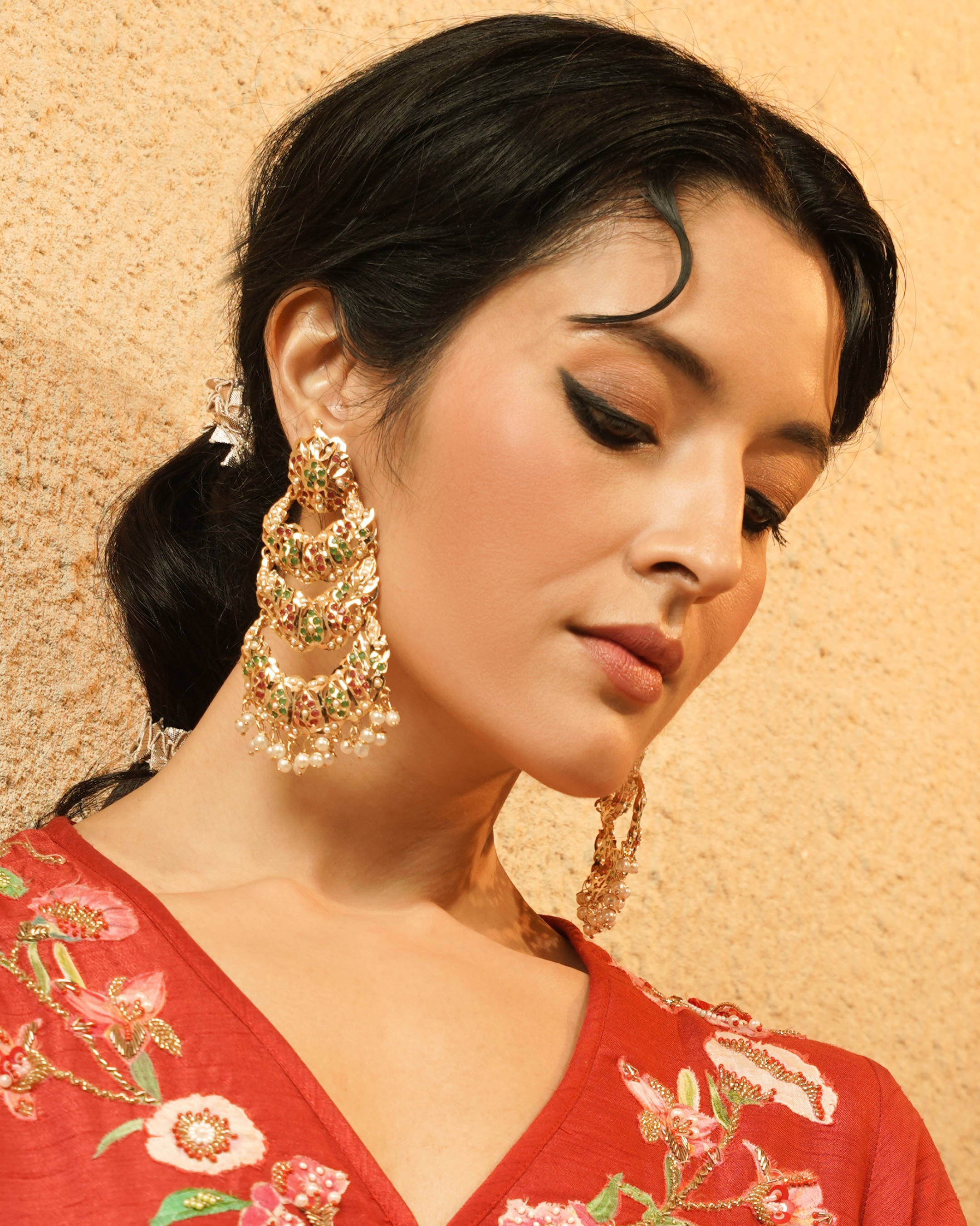 The triple layer gold-plated earrings have an unforgettable combination of jadau and pearls that makes them perfect for Indian ensembles.These Sitara multicolour jadau chandbali earrings will give an elegant touch to your attire and makes you stand out in the crowd. Combine our jewelry with a matching Suit, Saree or Lehenga and be in the limelight of every single occasion.