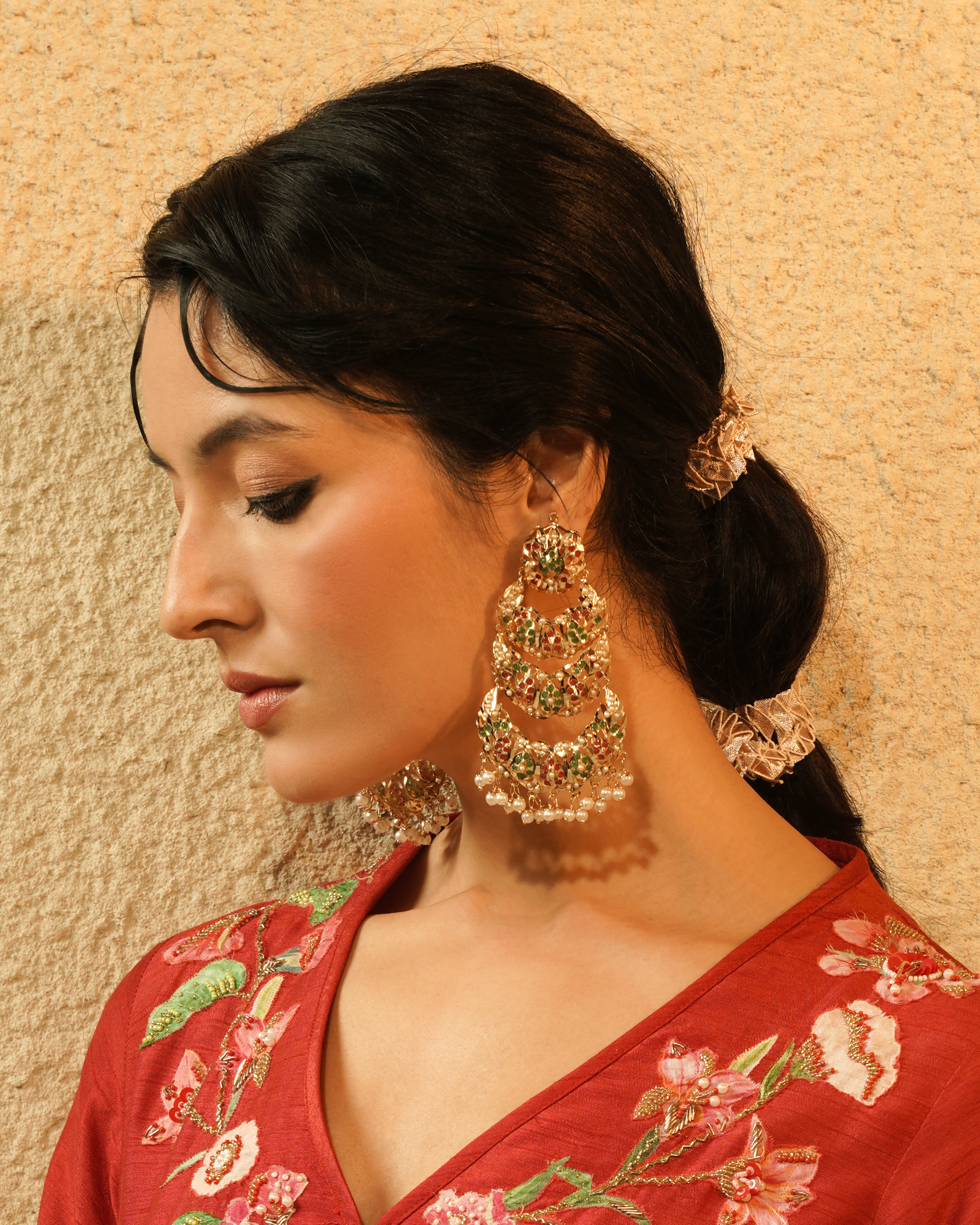 Sitara Triple layer Multicolour Jadau Chandbali Earrings