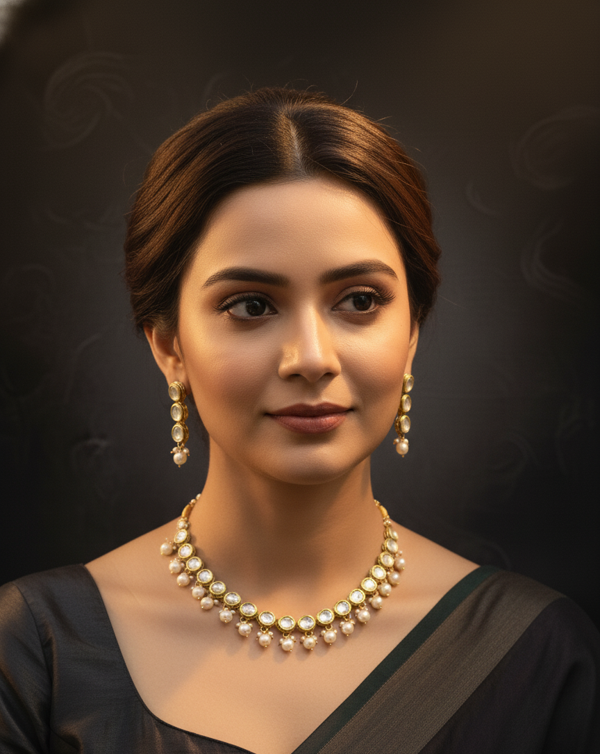 Grace meets elegance in our Neutral Kundan Radiance Set. This timeless jewellery set features beautifully handcrafted Kundan work in subtle neutral tones, making it perfect for both festive occasions and modern celebrations. The intricate detailing reflects classic charm, while the light, radiant finish adds a touch of sophistication to any outfit.