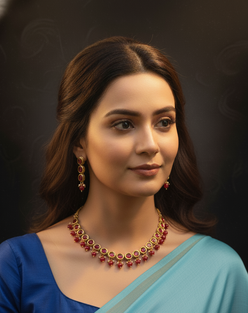 Grace meets elegance in our Ruby Kundan Radiance Set. This timeless jewellery set features beautifully handcrafted Kundan work in subtle ruby tones, making it perfect for both festive occasions and modern celebrations. The intricate detailing reflects classic charm, while the light, radiant finish adds a touch of sophistication to any outfit.