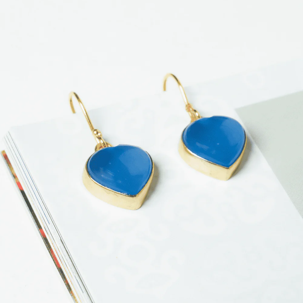 This chic pair of Heart Earrings are 18k golden plated and feature an eye-catching blue onyx semi-precious stone. The subtle sophistication of these earrings make them an ideal accessory for any outfit. They feature adjustable hook closures for ease and comfort.