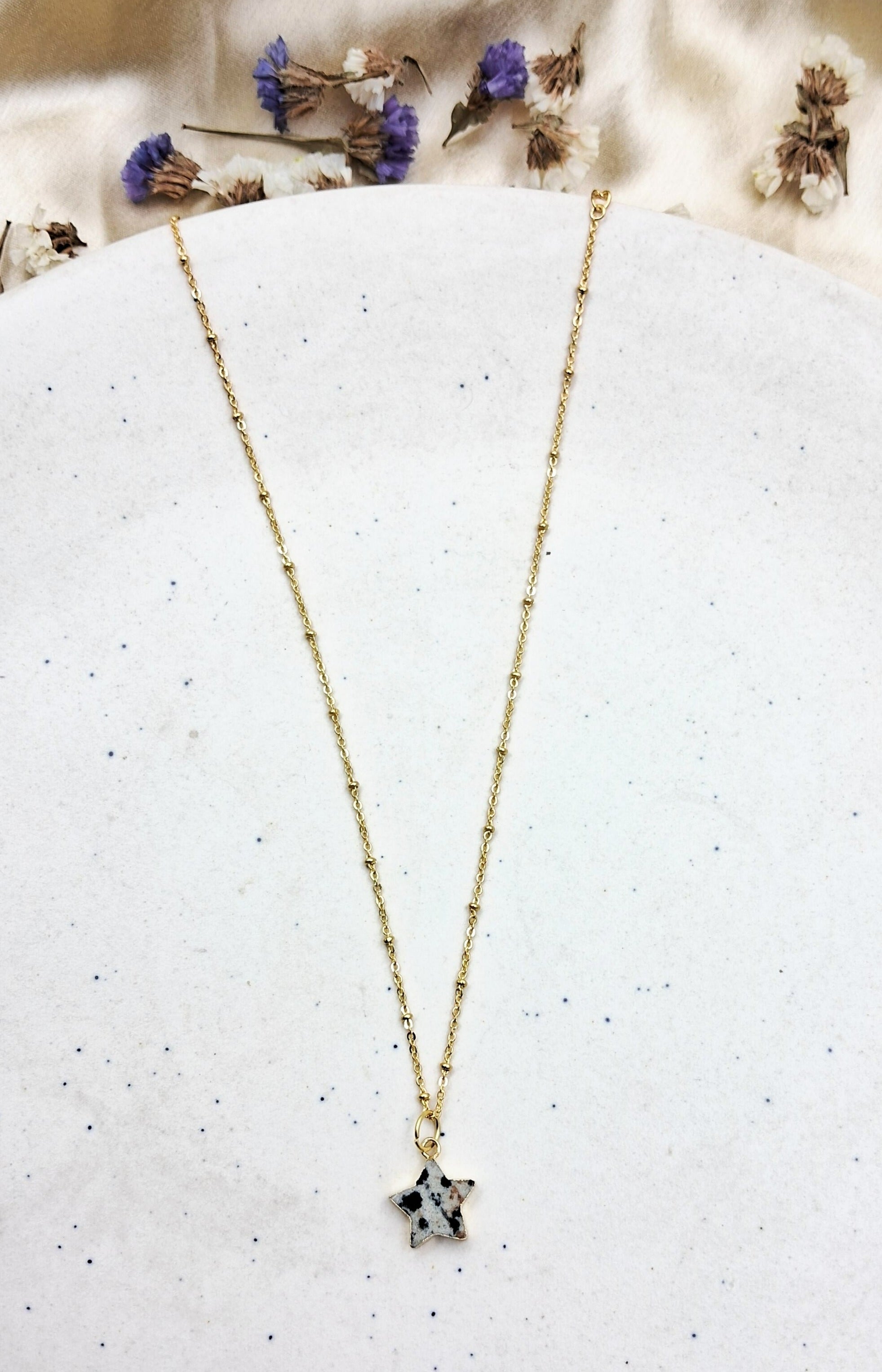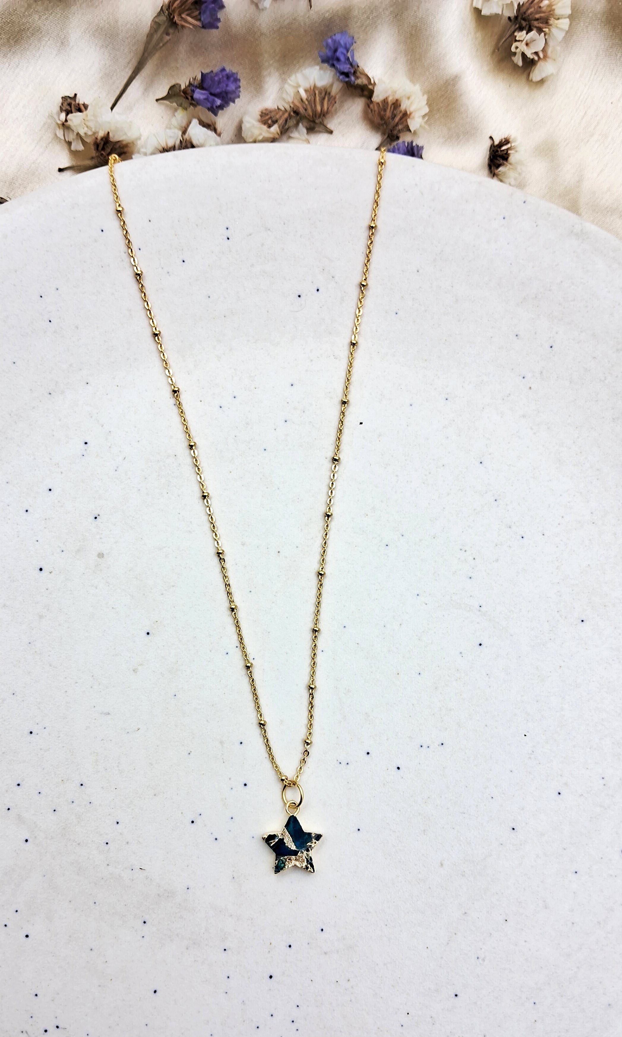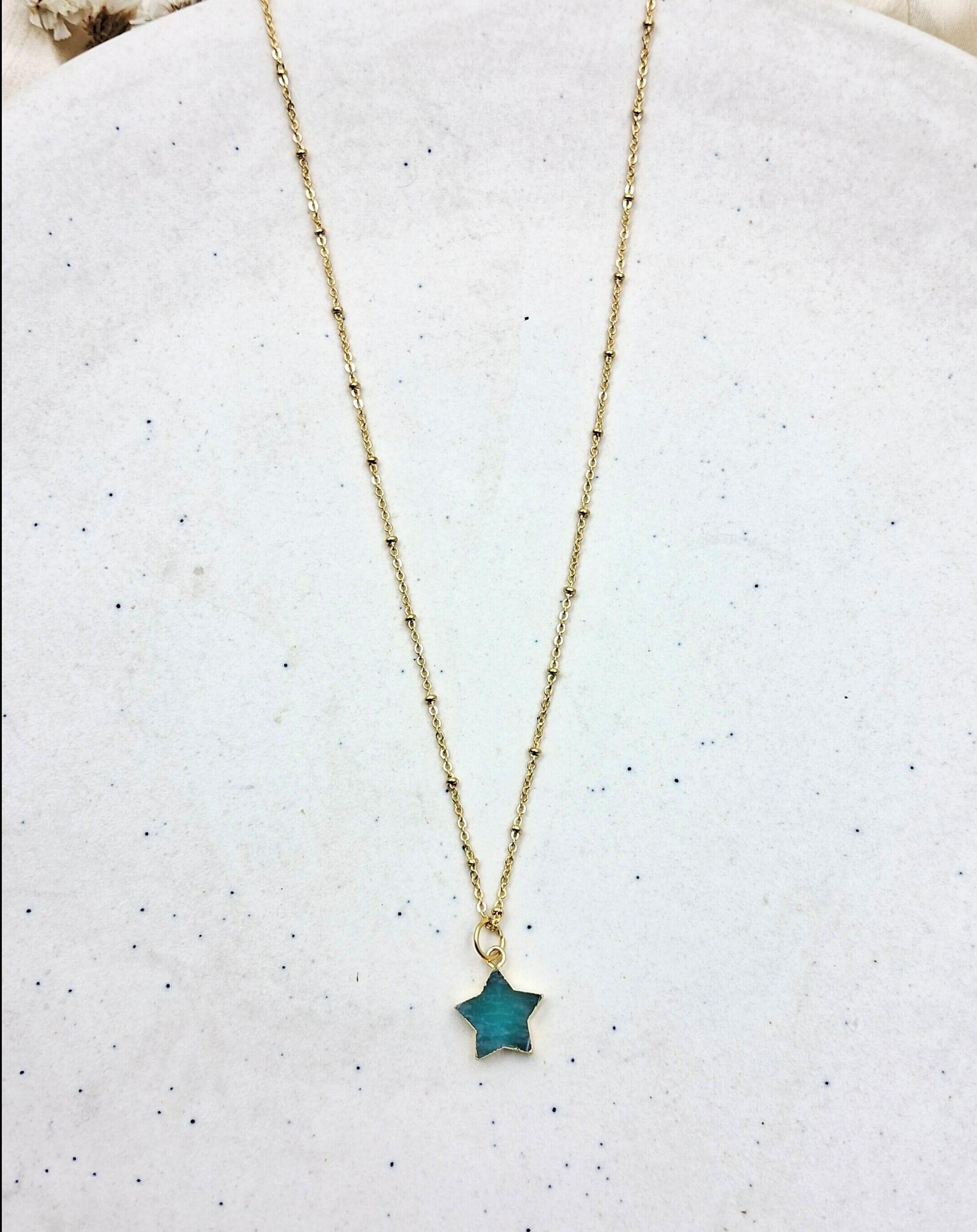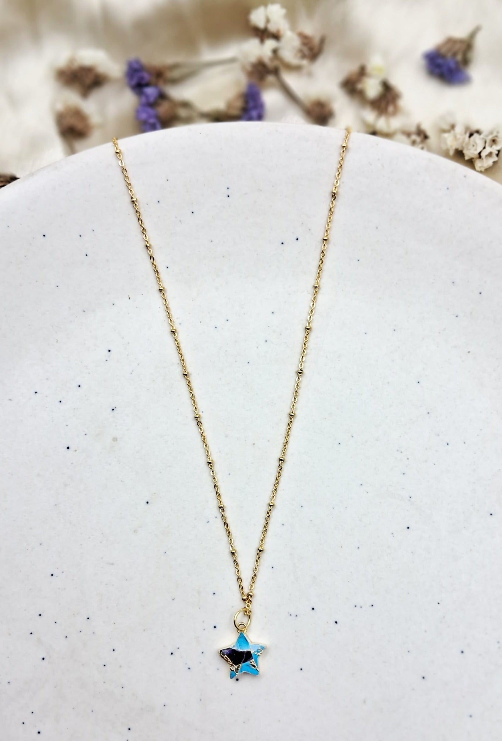 Elevate your workwear aesthetic with the captivating allure of Mohave semi-precious stone pendant. These exquisite accessories are meticulously crafted to showcase the inherent beauty of semi-precious stones. Each pendant features a unique, hand-selected stone in a variety of colors and shapes including the whimsical star design.