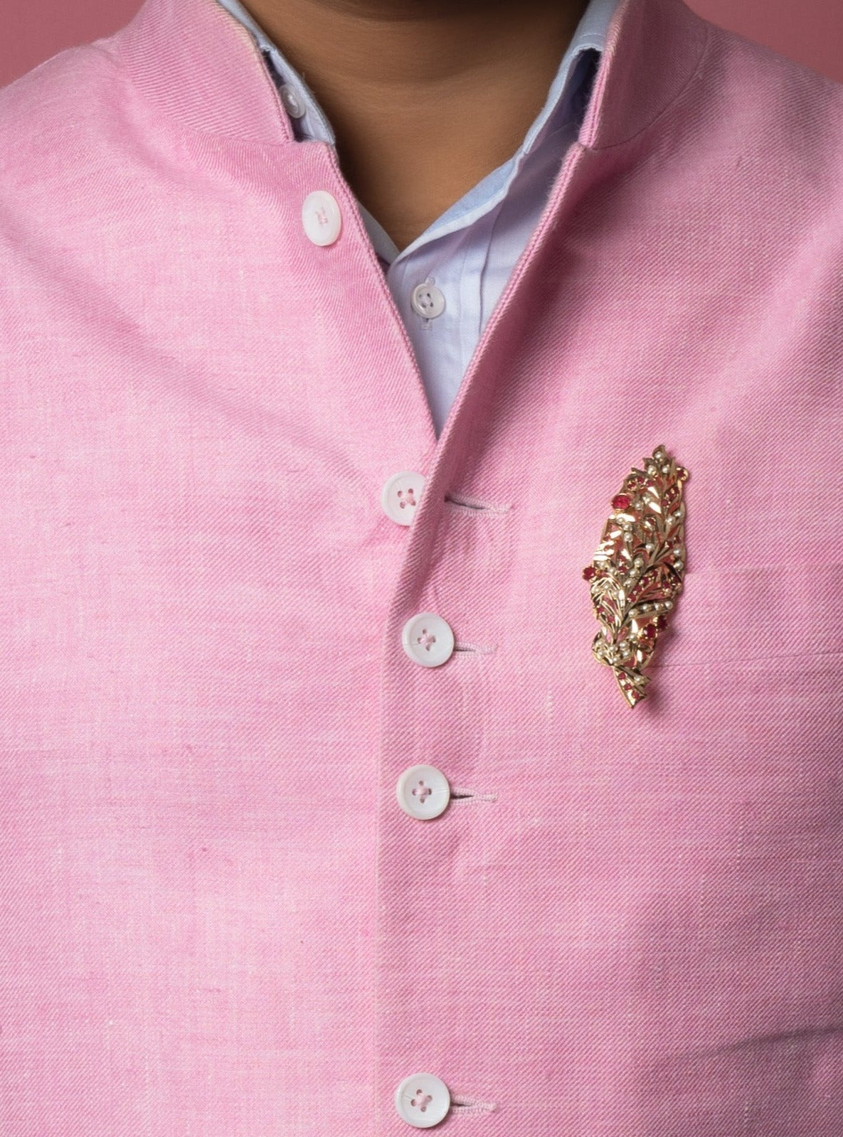 Elevate your wedding attire with our dazzling Jacket Brooch in Ruby Red Color - Gold Plated! Designed for grooms, this 18 carat Gold Plated brooch perfectly complements the bride's red outfit. Make a bold statement with this eye-catching accessory.